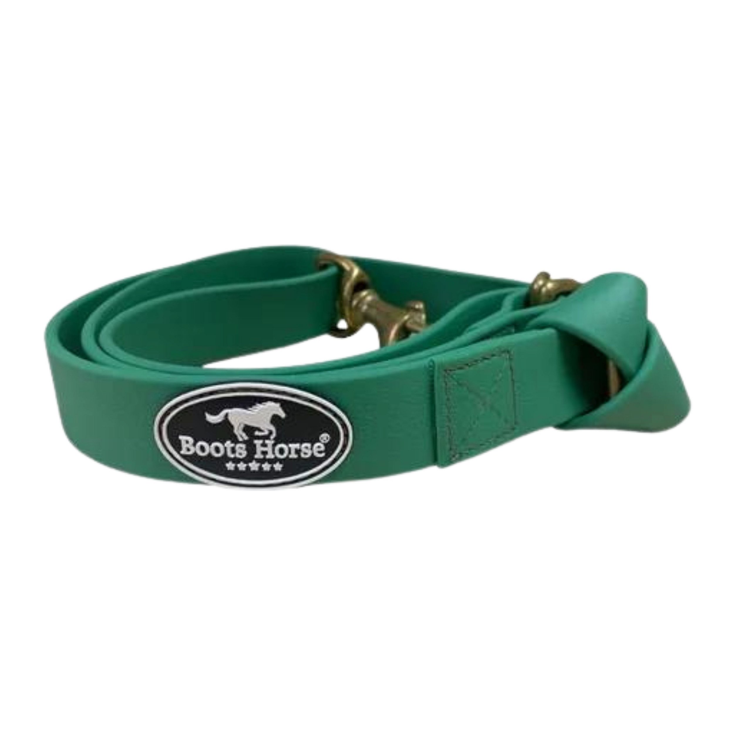 Cabo de gamarra Boots Horse fabricado em Silicone com 2,5 cm de largura super reforçado, possui 2 mosquetões de latão e meia-argolas de metal com banho niquel. Comprimento aproximado de 80 cm.