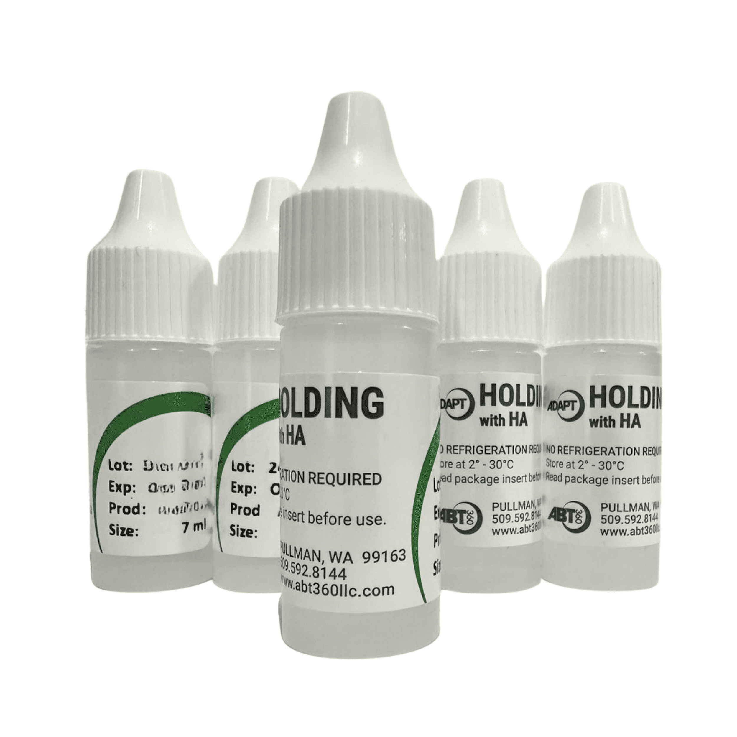 O meio ADAPT Holding com HA (Hialuronico) da ABT proporciona aos embriões um ambiente sustentável e saudável após a coleta e antes da transferência ou congelamento. Adaptamos nossa formulação ABT Holding excluindo componentes de origem animal, ajudando a aliviar preocupações sobre transporte e armazenamento com temperatura controlada, bem como potenciais riscos biológicos. ADAPT Holding contém Hialuronico (HA), uma macromolécula que substitui a albumina sérica bovina comumente usada em outros meios de transferência de embriões.