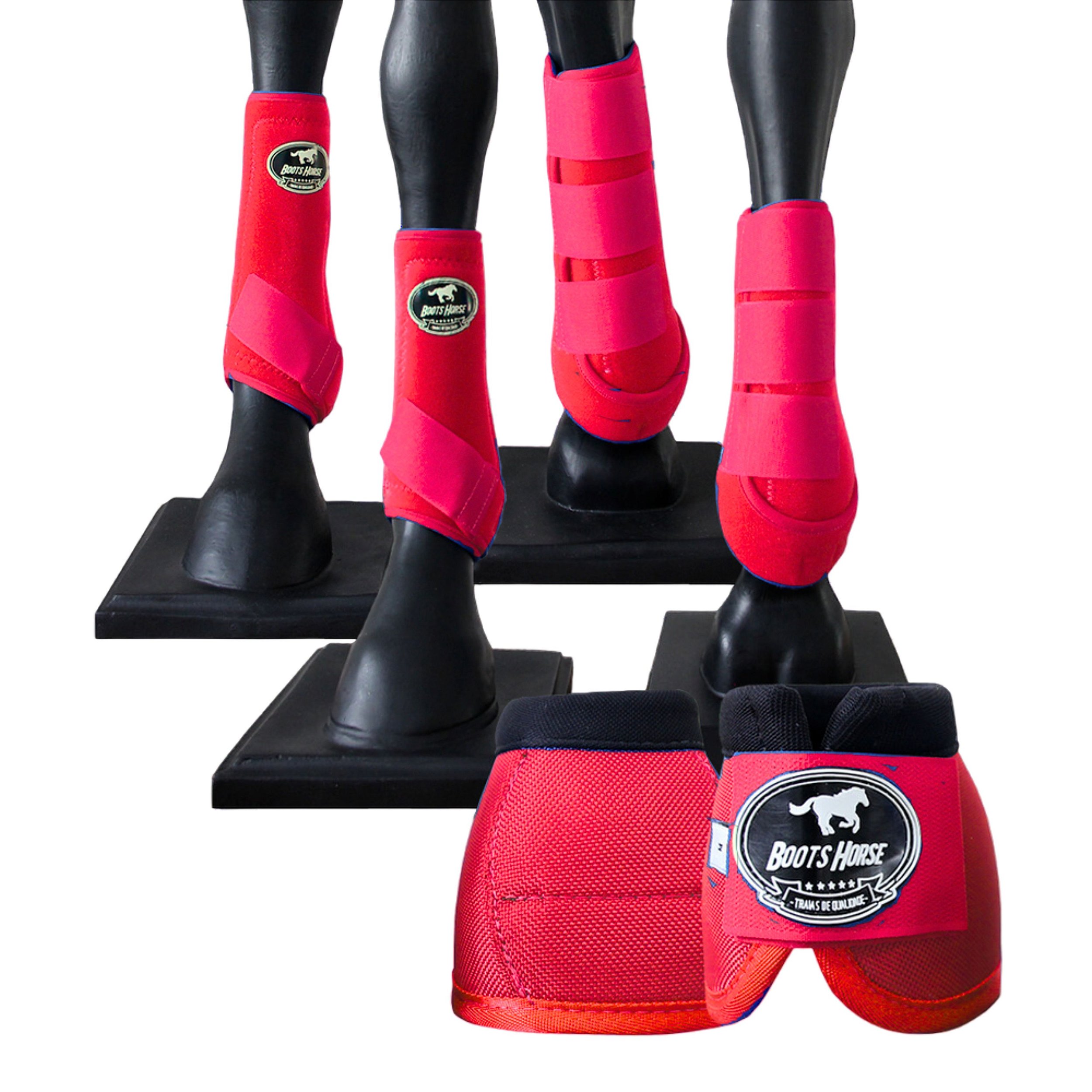 O conjunto é composto por um par de Boleteiras dianteiras, um par de Boleteiras traseiras e um par de Cloches dianteiros, os quais são recomendados para garantir a proteção das patas sem abrir mão do estilo, com as cores características da marca Boots Horse.
