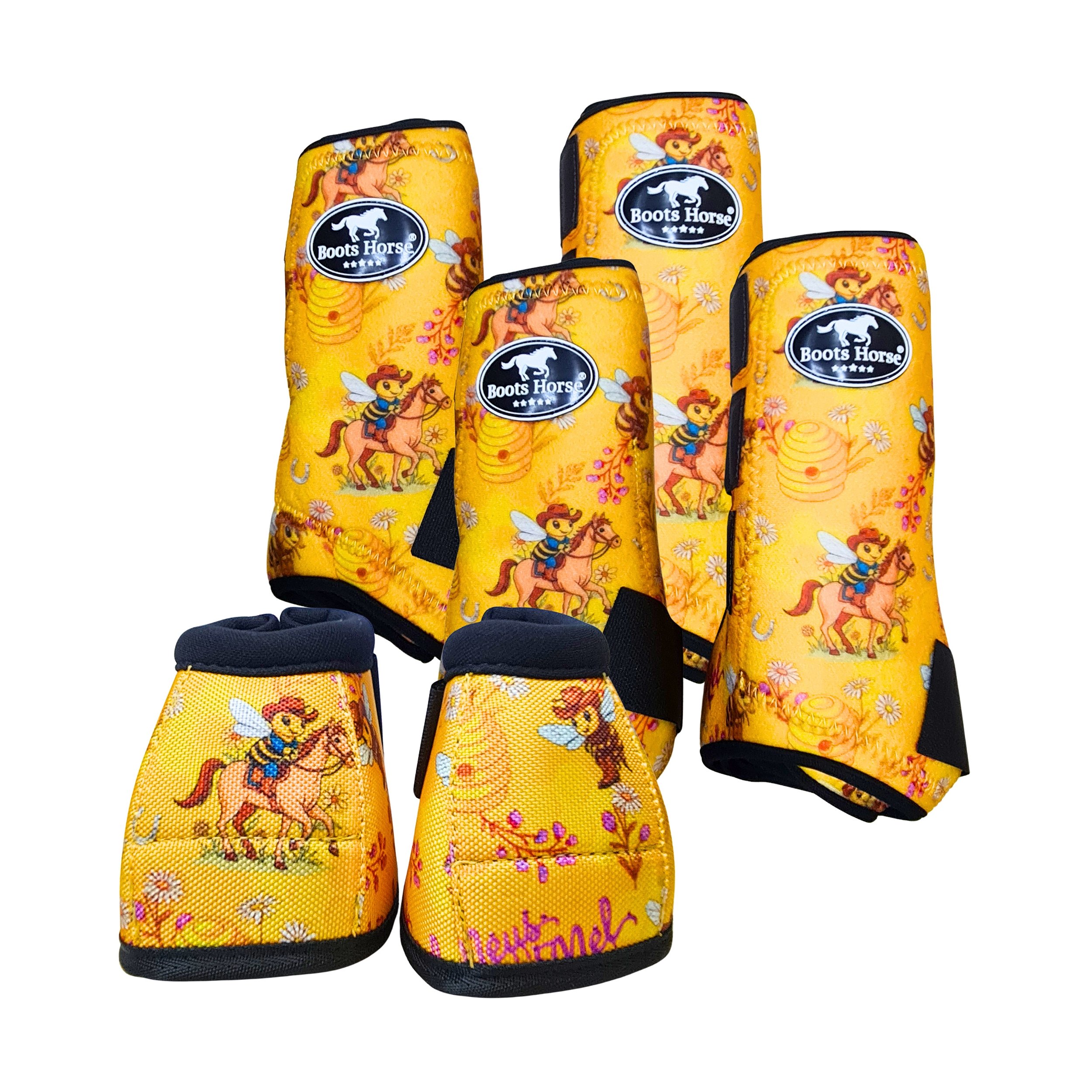O conjunto é composto por um par de Boleteiras dianteiras, um par de Boleteiras traseiras e um par de Cloches dianteiros, os quais são recomendados para garantir a proteção das patas sem abrir mão do estilo, com as cores características da marca Boots Horse.