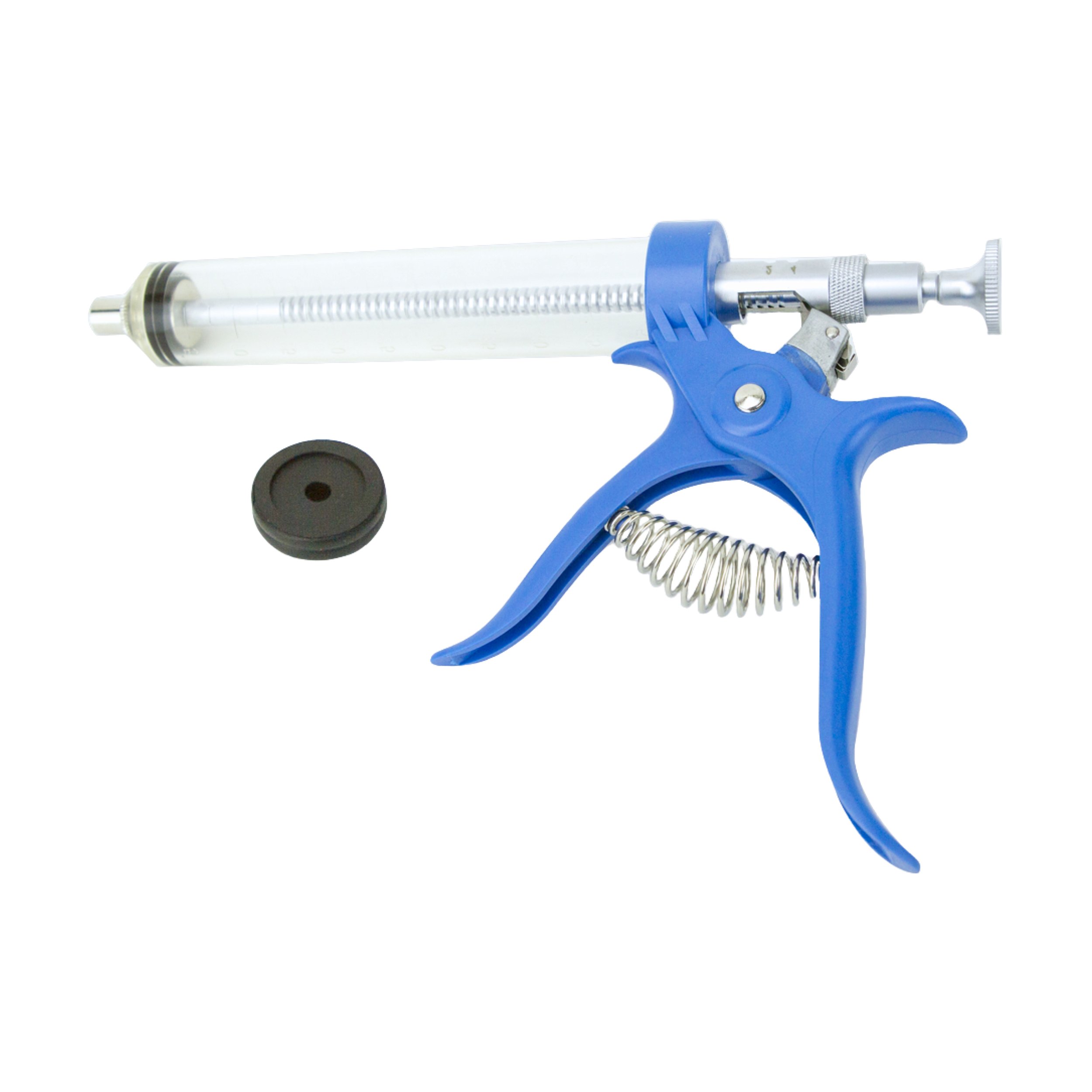 A pistola vacinadora Pro-Shot é robusta, feita de plástico de alto impacto, durável e extremamente leve. Sua mecânica de dosagem simples pode ser facilmente ajustada de 1 a 50 mL. Esta seringa possui um êmbolo de nylon não ajustável e um conector Luer Lock.