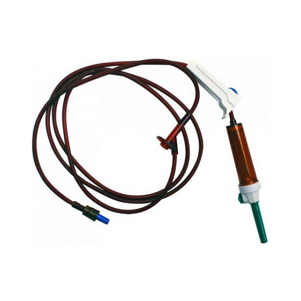 Dispositivo utilizado para administração de soluções a partir de recipiente especifico até o dispositivo de acesso venoso. O escoamento da solução se dá por meio da gravidade e a regulagem do gotejamento se dá por meio da pinça rolete. Equipo macro gotas, de infusão por gravidade, entrada de ar IS-AD, com filtro, câmara de gotejamento regular de fluxo tipo V, sítio de injeção em conector Y com membrana auto cicatrizante, conector Luer Lock PGC 6% na cor âmbar.